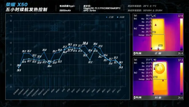 另一个和耐用性相关的就是电池续航了。大电池是这类手机的标配,荣耀 X50 这次搭载的是一块 5800mAh 的高能量密度电池,比上一代荣耀 X40 的 5100mAh 提高不少。在我们实验室的 5 小时续航测试中,荣耀 X50 还能剩余 63% 的电量,应对一整天的使用是绰绰有余。并且在整个过程中,机身最高温度也不过 38℃。