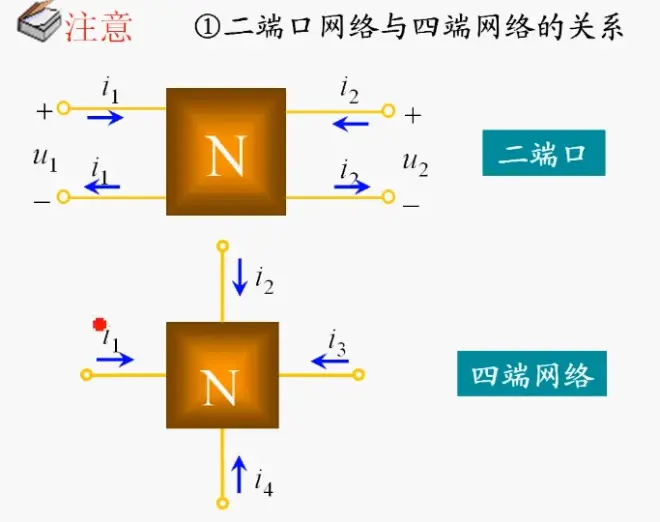 ① 二端口网络满足一对端子流入电流等于流出电流,而另一对端子流入电流等于流出电流这个端口条件;若向外伸出的四个端子不满足上述条件,称为四端网络。
