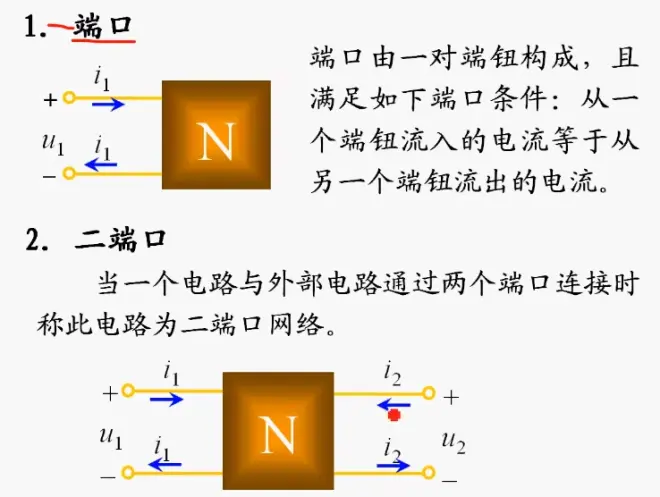 1. 端口:由一对端子组成,满足从一个端子流入的电流等于从另一个端子流出的电流的条件。