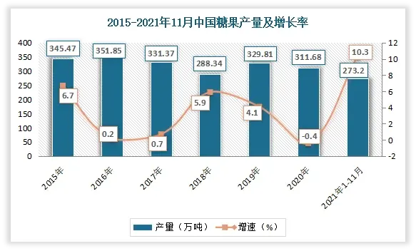 下游市场快速发展带动麦芽糖发展。例如糖果方面,作为我国传统的两大支柱零食产业之一,保持着快速的增长,潜力市场份额不断扩张。数据显示,2021年1-11月中国糖果累计产量为273.2万吨,同比增长10.3%。而随着下游市场不断发展,对麦芽糖的需求也在不断扩展。