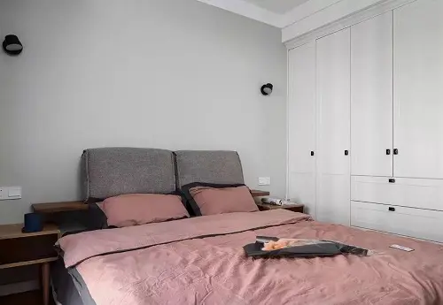 主卧室内部用灰色来搭配粉色和白色,再加上复古的木质造型,整个卧室给人一种优雅、轻奢的感觉,简洁当中又透露出了设计感。