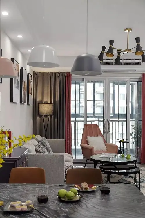 从餐厅看往客厅,客厅的搭配也比较简洁,双色的窗帘让客厅多出一些活力感,顶部加上创意的蜘蛛吊灯和侧方的筒灯,光源非常丰富。