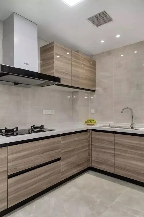 厨房内部的橱柜做了L形的布局方案,整体是比较现代风的设计,简洁的橱柜和墙地砖,通过自身的纹理来提升厨房的颜值。