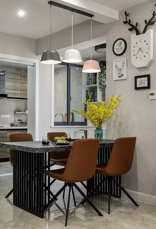 大理石的餐桌桌面搭配黑色的铁艺桌脚,墙面上点缀一些挂画和时钟,再加上干花和不同颜***灯,整个餐厅营造出了一种小资格调感。