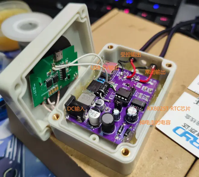 根据任务要求,使用爱普生RX8025T实时时钟芯片作为RTC时钟源,该芯片支持自动温度补偿,年误差30s以内。输出端预留3个开孔,可以根据需要选择受控输出(定时断电)或常闭输出(从不断电),光猫、路由器等需要断电的设备接在受控输出端,交换机、电视盒子、NAS等不需要断电的设备接在常闭输出端。考虑到这些电器周围可能存在5V供电的设备,设计时还加入了LM2596S Buck电路提供一路5V USB输出。DC定时开关内部如下图所示: