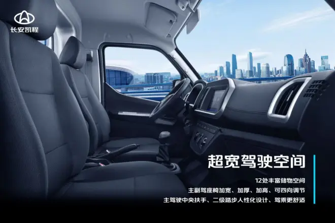 长安神骐T30EV驾驶室横向空间宽1.66米,腹部空间、腿部空间、头部空间都领先同类竞品,让舒适与自在始终相伴。最多共计12处的丰富储物空间,能满足用户大小随身物品的有序摆放,空间灵活更自由。