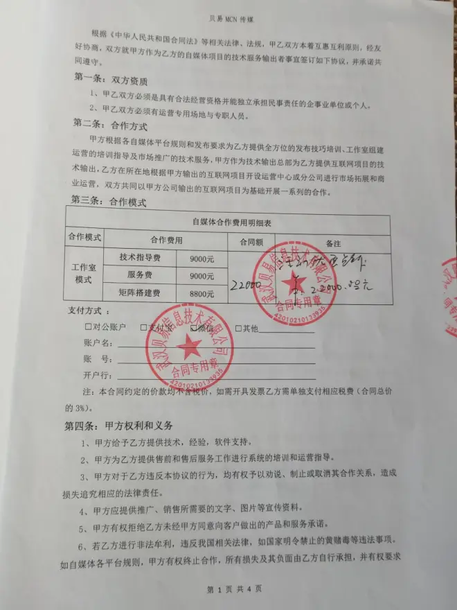 武汉雨笙科技有限公司、鑫贝易科技有限公司在合同中明确写了倒卖百家号100个,最后这帮骗子托工商所郑伟明,郑伟民帮这帮骗子退了我一万让我不再追究他们