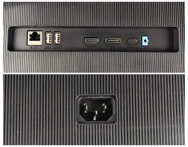 元创师H28的接口都位于显示器背面,支架的右侧为单独的电源插孔,支架的左侧从左到右依次为RJ 45有线网口、两个USB 2.0接口、HDMI 2.0接口、DP 1.2接口、Type-C接口和音频输出口。虽然只配备了USB2.0接口,但实测使用移动硬盘播放4k高清电影并未受到影响;至于HDMI 2.0接口和DP 1.2接口,对于元创师器H28的4K 60Hz也是足够使用。