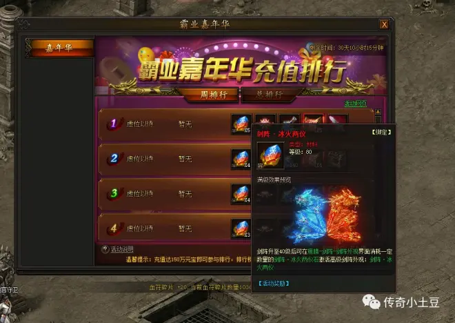 嘉年华活动在小编的记忆中应该是传奇霸业第二次搞,之前的话还是2021年的12月份搞的。时间的时间一共是3月1日-3月31日,分为周榜和月榜。周榜的话奖励主要是以剑阵*冰火两仪和绝版翅膀为主,但是呢这个绝版翅膀是限时的,上榜的标准就是一周内达到1.5w充值咯~然后进行排名获得奖励。
