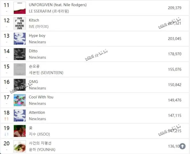 入榜的有: newjeans、田柾国、(G)I-DLE、IVE、Le sserafim、aespa、SEVENTEEN、金智秀、Younha、FIFTY FIFTY、林英雄、NCT、STAYC、防弹少年团、H1key、李茂珍、金晓钟、闵玧其、李彩演、ZB1、朴智旻、EXO、OH MY GIRL等