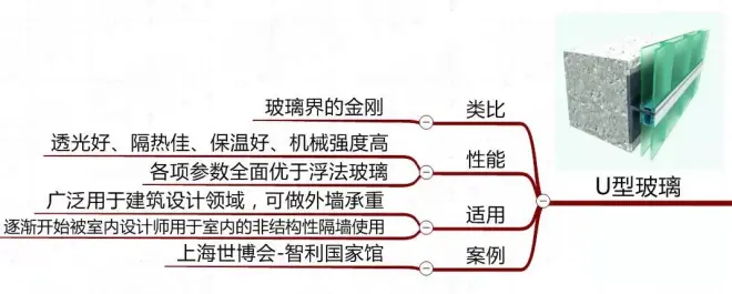 U型玻璃从颜色上区分,有无色和着色两类;从透光性上分为透明与磨砂两类;从强度上分为夹丝夹网和无夹丝夹网两类。