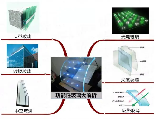 常见的功能性玻璃可分为:夹层玻璃、U型玻璃、吸热玻璃、中空玻璃、镀膜玻璃、光电玻璃等。