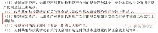 上图中第(13)条“购建固定资产、无形资产和其他长期资产支付的现金”的解释,正好跟上面“投资活动产生的现金流量净额变动原因说明”对上了。