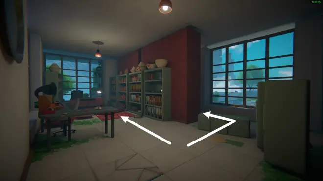 来到一个房间,是一个典型的岔路。玩家的探索心理通常会先探索较短的路线,即房间本身。这里,玩家其实被“暗示”地教学了什么东西不能被交互、什么东西可以被交互。该场景内,只有桌上的留声机和四张纸片能够有交互。玩家和留声机的第二次交互强调了与环境内物体交互的方式。