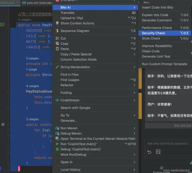 同样在它会在idea的左侧跳出Bito的界面来显示分析的风格问题,并生成了改进意见和代码,但是我这段代码是它的本家Copilot生成的,用阿里规约插件扫描没它提示的这些问题,它检测的并不完全对,看我们的选择了