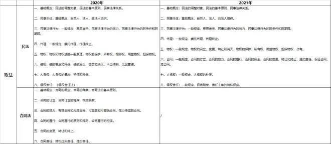 政法大纲从2020年到2021年间发生过变化,只有民法部分发生了较大的变化,其余部分一字未改。民法部分最大的变化为将去年的第五部分民法与第六部分合同法合二为一,变为今年的一个部分即第五部分民法,这主要是因为《民法典》的出台,合同这一部分已经并入民法典中。具体变化详见下表: