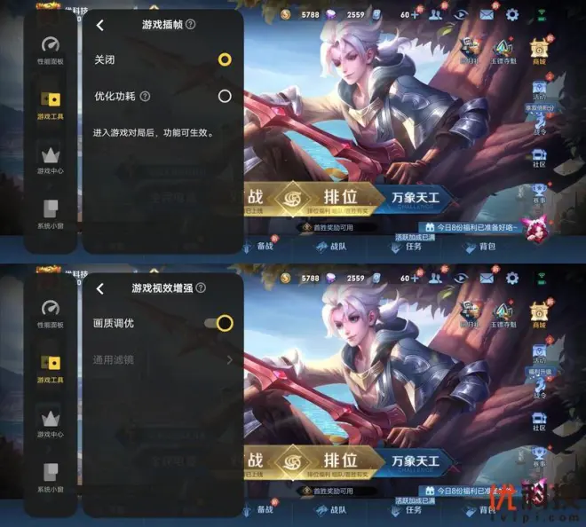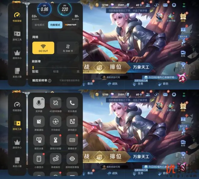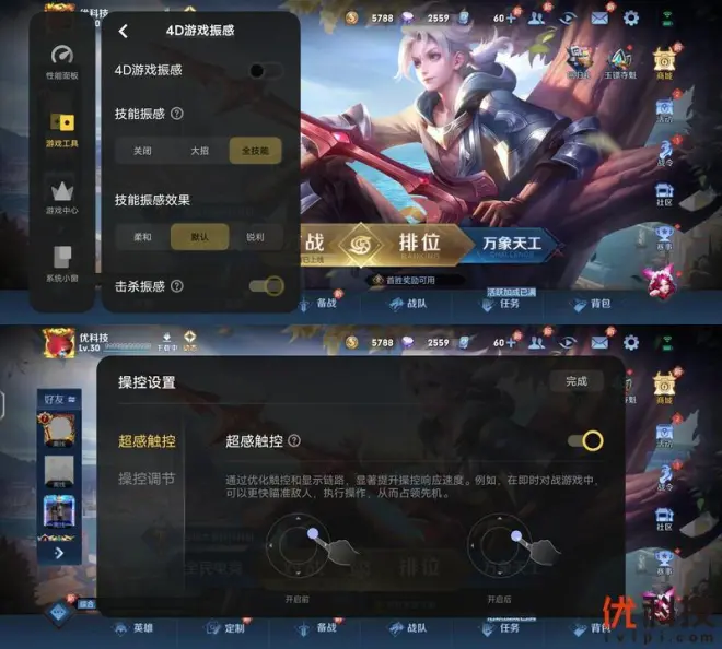 游戏工具内还可以开启4D游戏振感,开启后基于双X轴线性马达,实现左右分别振动,针对具有指向性技能的英雄,将指向性技能调教为方位振感。重点突出双X轴马达的方位感和细腻感。而超感触控则是通过优化触控和显示链路来提升操控响应速度。