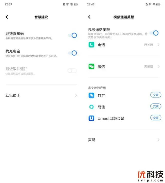 至于辅助动能方面则是支持地铁乘车码、找充电宝以及附近取件通知和红包助手等实用功能,另外依旧支持视频通话美颜功能,支持的程序也是较为全面。