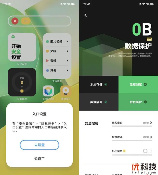 关于隐私空间方面做的也是非常的不错,用户可以设定单独的隐私空间,以及其中的图片、视频、文档等数据,并且支持单独指纹快捷进入。