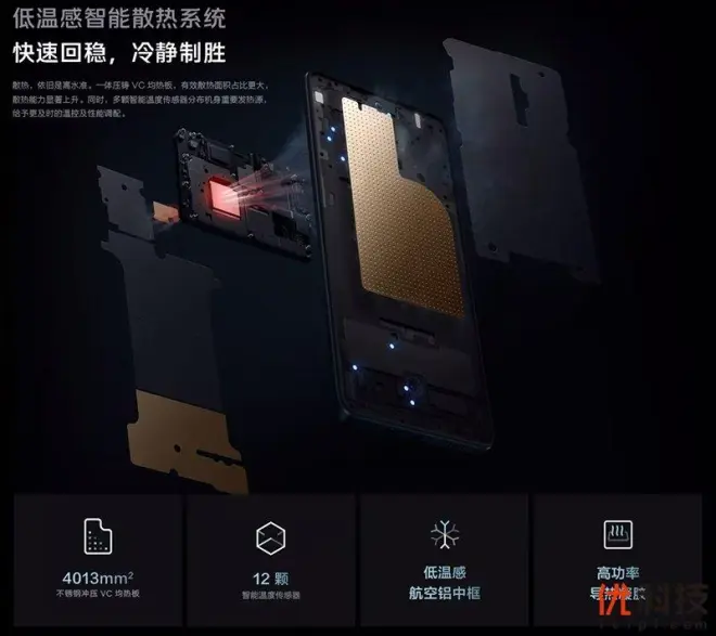 在有着强悍硬件配置的基础上,iQOO 11S的散热系统也是非常的强悍,其采用了低温感智能散热系统,总面积达24768mm2,其中采用了4013mm²大面积VC均热板,同时还配备了贴合式立体石墨以及导热系数达到6W的高功率导热凝胶,配合着低温感航空铝中框可以有效的快速散热,并且在机身内主副板等位置安置12颗智能温度NTC传感器,检测机身温度更加精准、及时,可避免因提前或延迟触发温控,导致的游戏性能降低、壳温过高等影响使用体验的情况。