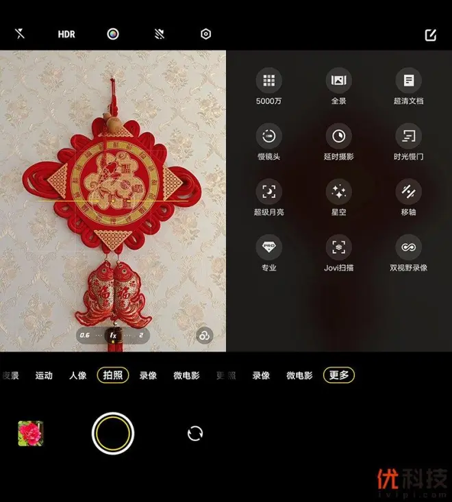 至于相机页面操作上也是非常的容易上手,首先取景窗顶部为闪光灯控制、HDR功能键以及自然色彩和微距开关。取景窗下方则为变焦切换以及滤镜选择,底部控制区则为相机模式选择。而在最右侧的更多选项中则是汇聚了5000万像素支出、全景、时光慢门以及专业等模式选择,并且支持自定义编辑。