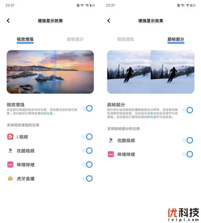 得益于搭载了iQOO超算独显芯片,iQOO 11S在显示效果方面也有着不错的加强,例如视效增强和超帧超分,实现双擎并发,为主流的30帧普清视频内容源,带来清晰流畅的视觉体验,如同解锁更高帧率和码流,堪比视频网站会员级画质,覆盖哔哩哔哩、优酷、腾讯视频等主流平台的绝大多数视频内容。