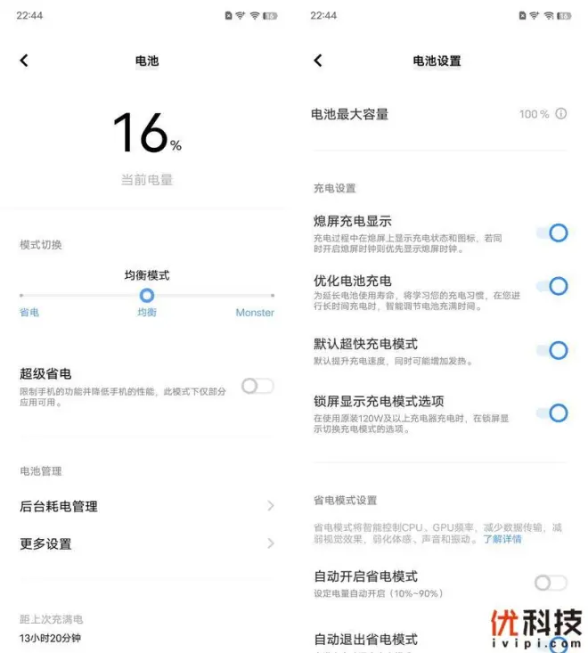 至于电池设置方面也是非常的全面,系统支持省电、均衡以及Monster和超级省电四种模式,用户可以手动切换,同时还提供了本机电池的健康度显示,此外如熄屏充电显示、优化电池充电等功能也是均有支持,并且还支持锁屏显示充电模式选项,非常的细致。