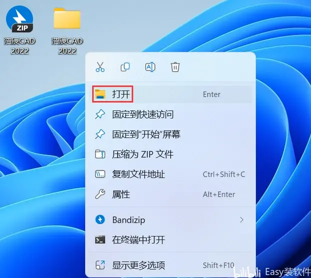 14、回到桌面,右键桌面上的【浩辰CAD 2022软件图标】,点击【打开】;注意:软件打开显示试用30天,实际可以无限制循环使用