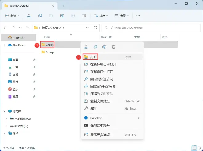 10、回到浩辰CAD 2022文件夹,找到【Crack】文件夹,右键【打开】它