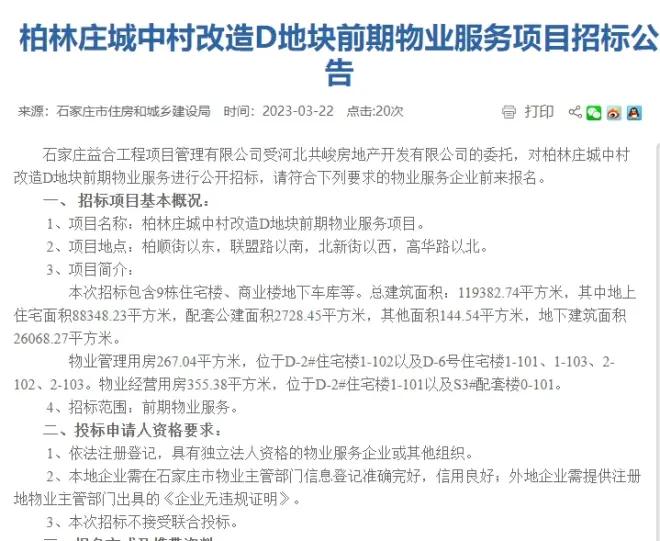 3月22日,凤凰网房产从石家庄住建局获悉,柏林庄城中村改造D地块正在进行前期物业服务项目招标。