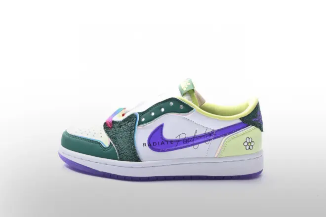 乔丹 Air Jordan 1 Low OG Doernbecher 慈善低帮运动鞋FD9665-351。鞋侧 Swoosh 处 Radiate positivity 表达 Mahajan 对待生活的积极态度。鞋子细节满满。