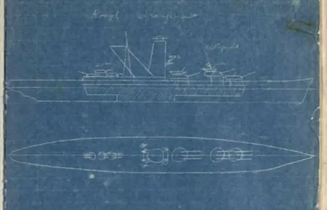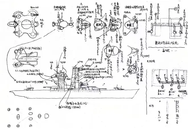 ①草图的舰桥上采用的是30年代才有的一体化测距塔设计,和金刚代舰时期的测距仪和方位盘的配置不同