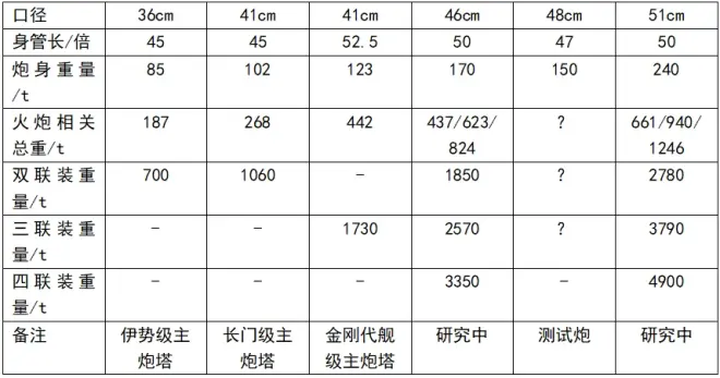 ①在金刚和扶桑时期曾经就50倍30cm炮和45倍36cm炮的选择有过很长时间的争议,最终认定50倍炮在身管寿命和误差方面存在劣势,从而选择了45倍的36cm炮。但随着技术进步,50倍及以上身管的大口径舰炮的可靠性越来越高,从八八舰队中后期开始便得到了重视。所以在这个时期,舰本一部计划的46cm和51cm炮都是50倍。由于条约的影响,首先完成的大口径长身管炮是2门50倍三年式36cm炮。