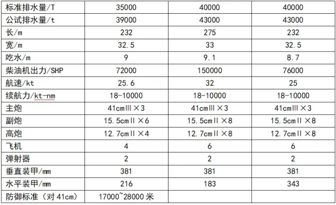 由此看来,最小的36cm搭载舰,也就是25000T代舰的防护水平不输后来完成的南达科他级战列舰,而更大的27500/28000T代舰的水平防御直接远超南达科他级。所以纵使存在主炮上的劣势,这个系列依然有对抗各国新锐的强大能力。