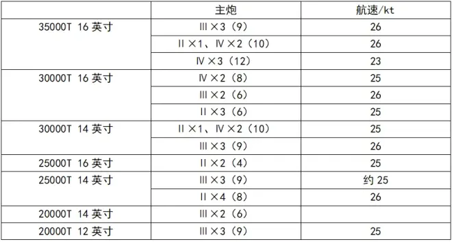 为了应对可能更为严苛的条约限制,舰本三部进行了35000T以下排水量的代舰的计划: