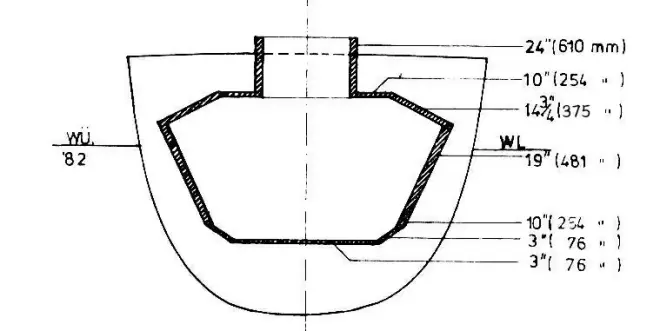防御标准相较第一案,弹药库上限和动力舱下限各削减5000米。换言之,就是弹药库部分削减了水平防护,动力舱削减了垂直防护。如果像第一案那样推测,那么装甲厚度就是:主装分为弹药库483mm/25°、动力舱406mm/25°,水平装甲为254mm。