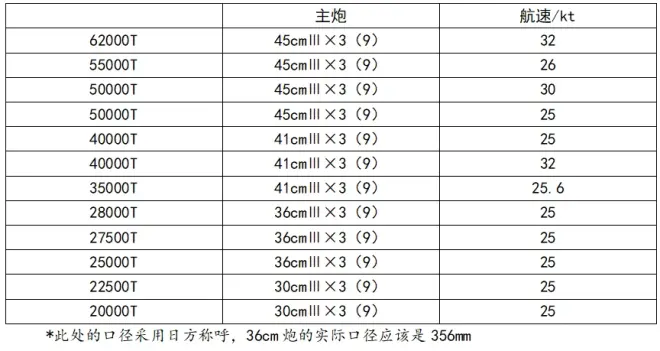 后面的40000吨两案很明显不符合海军条约体系,可能是刻意将吨位设定在船台可建造战列舰的上限。以当时日本的造船技术而言,在陆上船台完成建造后,并安全地从船台下水的下水重量在30000吨以内。因此,能在船台建造的最大主力舰排水量约35000~39000吨,更大的就只能在低于海平面的船坞内建造了。