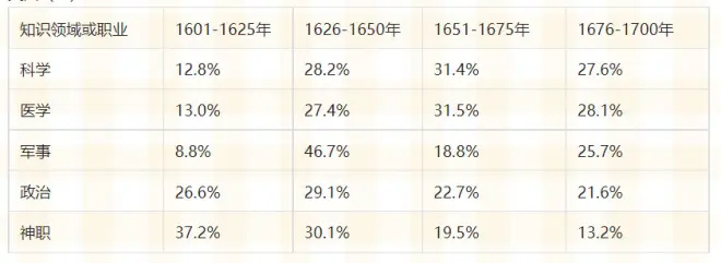 13.下表摘自学者对英国《国民传记词典》中6000多位传主从业兴趣的统计,据此可推断,17世纪的英国( )