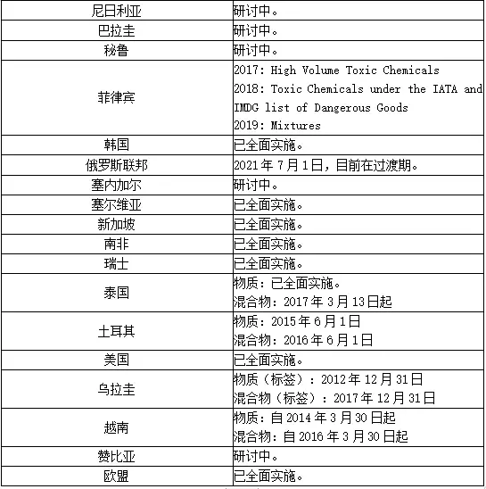 GHS是什么意思,化学品安全技术说明书MSDS报告和GHS实施进展表详情,部分国家GHS实施情况: