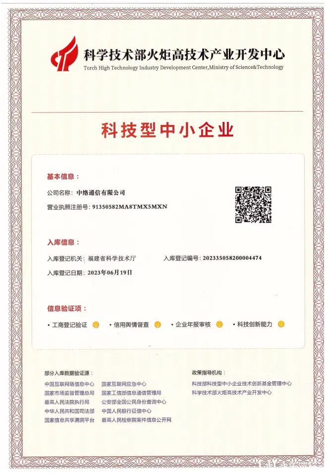 根据《科技型中小企业评价办法》和《科技型中小企业评价服务工作指引》的有关规定,中络通信有限公司,以下简称“中络通信”公司通过不懈努力,经市级、省级专家领导层层审核、推荐及评定,成功最终通过认定,成为“科技部科技型中小企业”,入库登记编号:202335058200004474 。