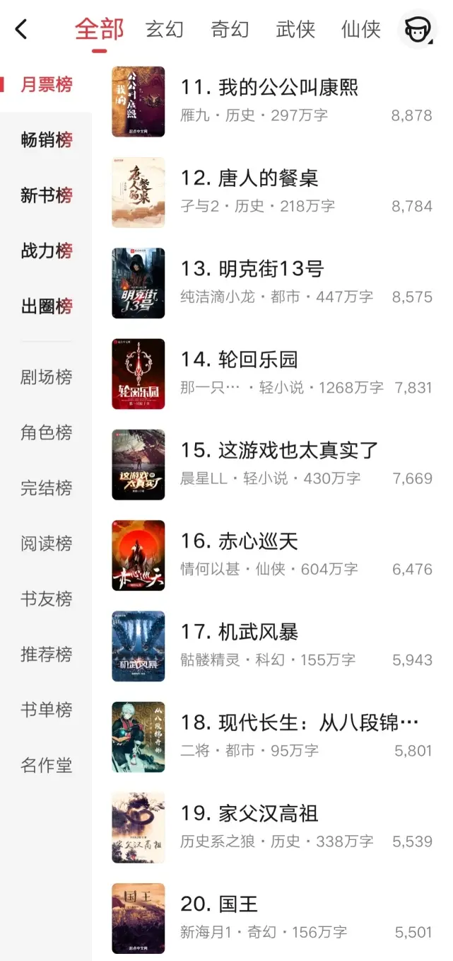以上就是这个月第一周月票榜部分作品的情况了,希望你喜欢的作品都有好的表现吧。那么本期就到这里,我们下期再见。