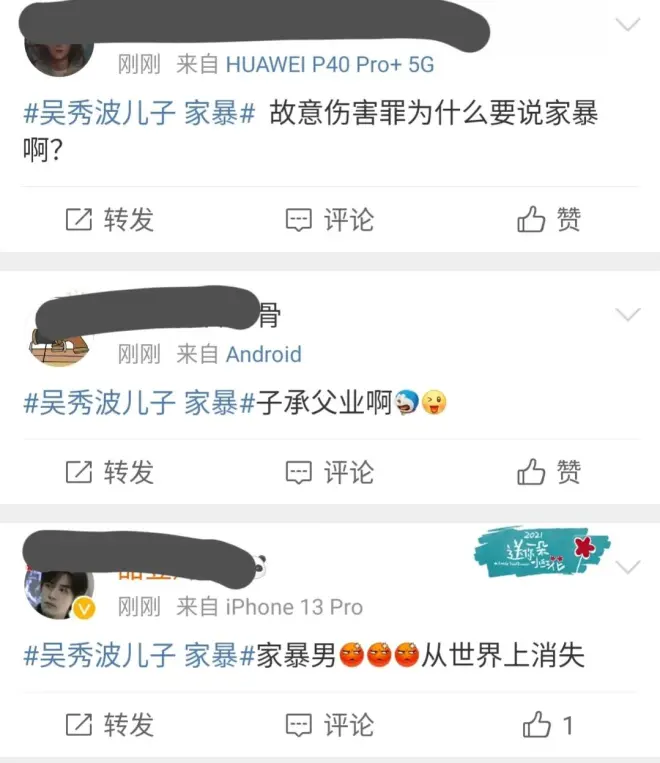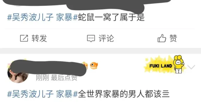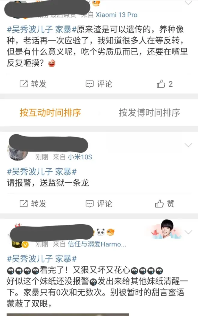 对于吴秀波长子家暴,网友也是深深地谴责家暴男,简直就是故意伤害。