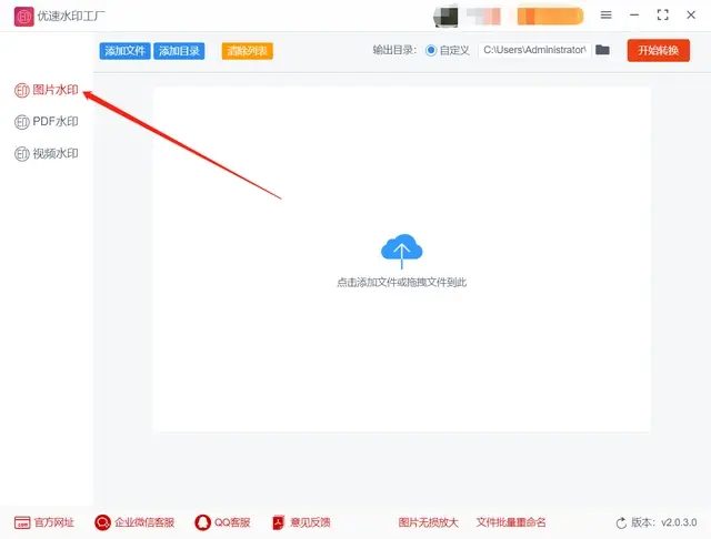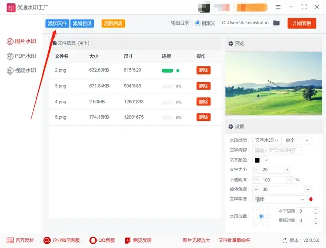 第2步:点击“添加文件”按钮,将需要添加文字水印的图片全部上传到软件中。优速水印工厂支持批量操作添加水印,无数量上限。