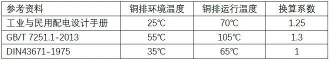 将DIN43671-1975的铜排载流量作为参考,工业与民用配电设计手册、GB/T7251.1标准中铜排载流量理论计算的系数如下表。