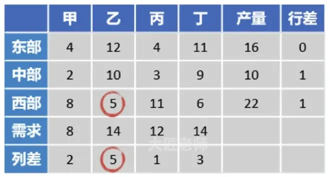 Step4:找到最大差额为丁的列差 2,第二次重复