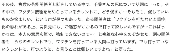 记者采访中得知,对于犹豫要不要打疫苗的艺人到底如何督促其去接种疫苗,其实时间很困难的事情,其中不乏「担心严重的副作用,不希望会对工作方面的人带来困惑,而且疫苗接种是基于自己的想法,也不能强制…」的声音。