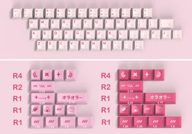 字母区采用片假名字根,支持:MX HHKB, 60%, 65% (含 1.75u Shift), 660/75%/80%/96、980/全尺寸/WKL 大门牙/分裂 Backspace