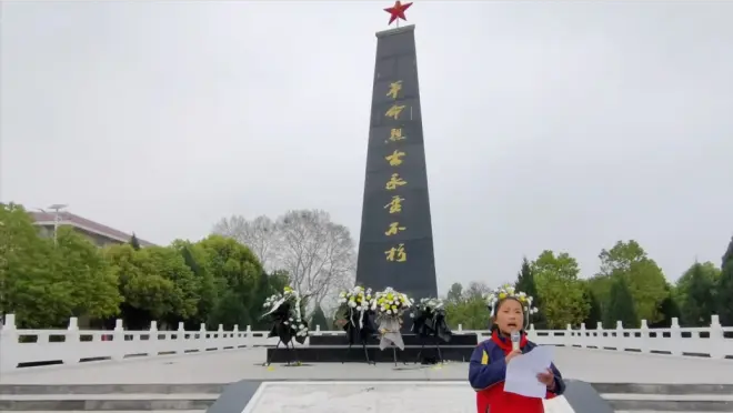 仪式第九项:由少先队员献花,并瞻仰烈士纪念碑抗日烈士纪念碑的由来以及讲解革命先烈的英雄事迹。