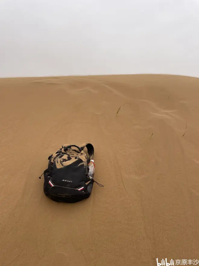 下了骆驼后,风沙还在刮,但依旧不严重。我就踱步来到了沙漠自由游玩区,在这里很多漂亮姐姐在迎风拍照,更多的则是租借滑沙板从沙丘上滑下来。此时我有些困倦,就迎着风沙,走到了离人群最远的一处沙丘。这处沙丘的坡较为陡峭,丘顶与丘底的高差较大,我便放下包、把防沙面具戴上;躺在沙坡上睡了一觉。虽然是白天,但沙子是冰冷的,只是没有那么刺骨而已。不过,远离人群、在遥远的沙漠里静静地躺着,看着头上越来越大的风以及卷起的黄沙,不得不说也是一种享受吧!由于困倦,我渐渐睡去……