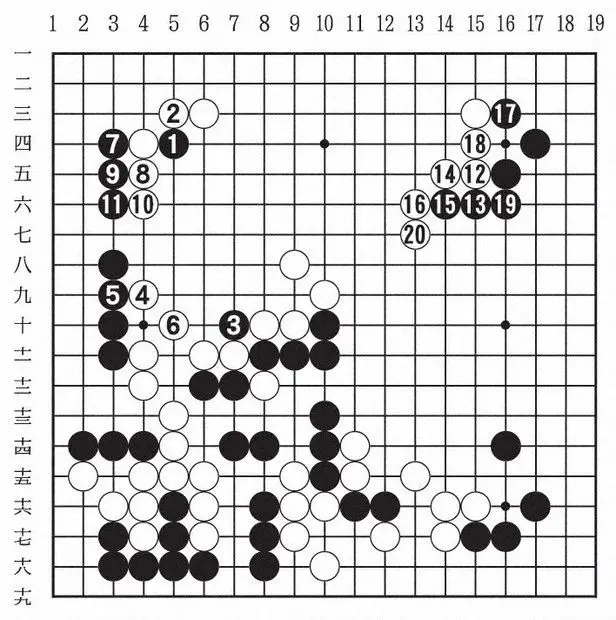 这盘棋布局阶段下得非常快,在第一天的时候感觉自己手感不错。封手之后右边变得非常厚实,就看左边的黑棋怎么处理。花了一点时间后我选择了白1,算清了黑棋大龙可以吃掉,就觉得这棋可以拿下了。上一期因为一盘棋都没能赢,所以这一场胜利对我来说意义非凡。
